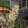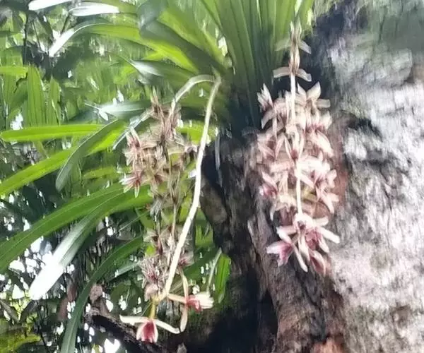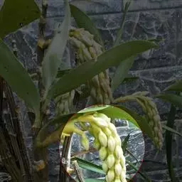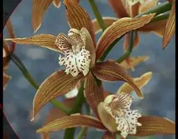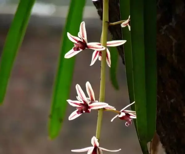 纹瓣兰 花葶从假鳞茎基部穿鞘而出,下垂,长20-60厘米;总状花序具(15-)20-35朵花;花苞片长2-5毫米;花梗和子房长1.2-2厘米;花略小,稍有香气;萼片与花瓣淡黄色至奶油黄色,中央有1条栗褐色宽带和若干条纹,唇瓣白色或奶油黄色而密生栗褐色纵纹;萼片狭长圆形至狭椭圆形,长1.5-2厘米,宽4-6毫米;