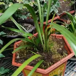 上盆(或翻盆)时间一般在春季3-4月或秋季10-11月。花盆以口小、盆深、底孔大的为佳。新从山上挖来的野生苗需理植于瓦盆(泥盆)中,这样兰花泥易干,通气性好.容易发根;2-3年后方可换人紫砂盆或瓷盆。兰花种植(在盆中)的方法与一般花卉不同,尤其是名种兰花,翻种移盆必须洗根。方法足将根浸入清水中,用旧牙刷或毛笔轻轻洗刷,切勿用力过大伤根;用剪刀将残叶、黄叶、断裂根、发黑腐烂根剪去,注意勿伤幼芽。然后将处理好的植株放在阴凉通风处晾干,待根部发白并显细小皱纹柔软时,再植入盆中。