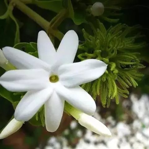 单瓣茉莉花冠管较长,约1,5厘米,雄蕊2枚,与雌蕊等长。聚散花序,顶生或腋生,每个花序着生3-12朵花,多的可达30多朵。花蕾略尖长,较小而轻。