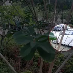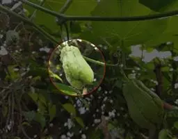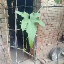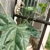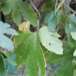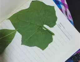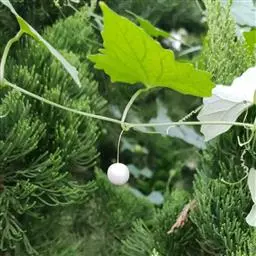 叶柄细,有纵条纹,长2-5厘米;叶片阔心形,长、宽均5-10厘米,常有5个角或稀近5中裂,两面布有颗粒状小凸点,先端钝圆,基部有数个腺体,腺体在叶背明显,呈穴状,弯缺近圆形,深和宽均1-2厘米。卷须纤细,无毛,不分歧。