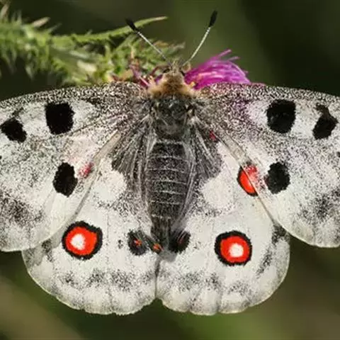 阿波罗绢蝶:翅展约7-8.4厘米。前翅较圆,白垩色,翅表有许多黑点、灰白斑及无鳞透明区,…