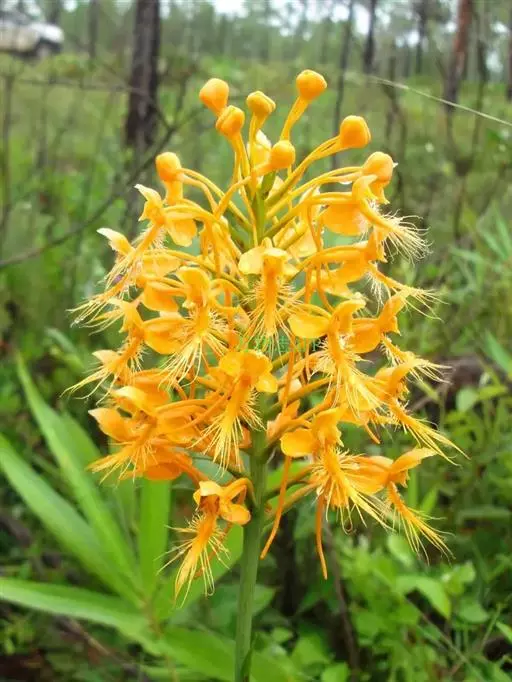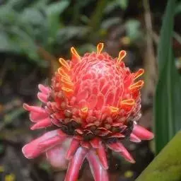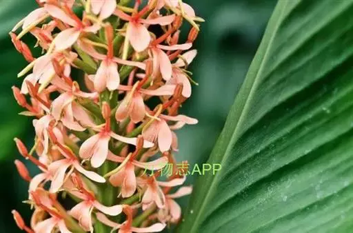 穗状花序稠密,稀较疏,圆柱形,长15-25厘米,径6-7厘米,花序轴粗壮,无毛或被稀疏的长柔毛;苞片革质,内卷或在稠密的花序上较扁平,长圆形,急尖或钝,长3-3.5厘米,顶端被疏柔毛,稀无毛,内有3花;花红色,花萼长2.5厘米,具3齿,特别是顶部被疏柔毛;花冠管稍超过萼,裂片线形,反折,长3厘米;侧生退化雄蕊披针形,长2.3厘米,唇瓣圆形,径约2厘米或较小,深2裂,基部具瓣柄;花丝长5厘米,花药干时弯曲,长7-8毫米;子房被绢毛,长2.5-3毫米。