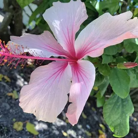 扶桑为常绿大灌木。径直立而多分枝,高可达 6 米 。盆栽者一般高 1 -3 米 。叶互生,阔卵形至狭卵形,长 7 — 10 厘米 ,具 3 主脉,先端突尖或渐尖,叶组有粗锯齿或缺刻,基部近全缘,秃净或背脉有少许疏毛,形拟桑叶。花大,有下垂或直上之柄,单生于上部叶腋间,有单瓣、重瓣之分:单瓣者漏斗形,通常玫瑰红色,直径约 10 厘米 ,雄蕊筒及柱头伸出于花冠之外;重瓣者非漏斗形,呈红、黄、粉等色,花径 10 -17 厘米 ,雄蕊筒及柱头不一定突出花冠外。蒴果卵圆形,光滑,有喙。花期全年,夏秋最盛。