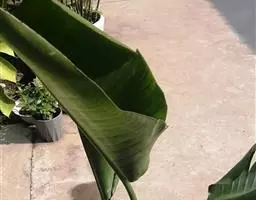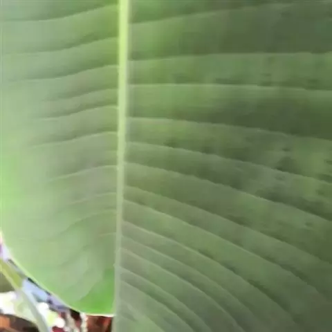大形多年生草本,高约 2 公尺以上,根茎着生多数肉质状根,侧生小茎可供繁殖。假茎由叶鞘紧包成圆柱形,顶端叶片多枚,叶柄长而粗大,内面沟状,背面圆形突起,延伸至叶片末端,叶片巨大形,长椭圆形,全缘而微疏低波状,侧脉平形射出状,长1公尺以上。