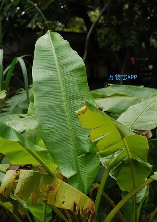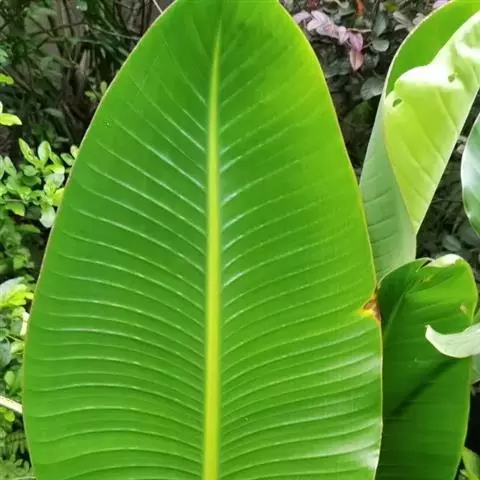 红蕉,假茎高1-2米。叶片长圆形,长1.8-2.2米,宽68-80厘米,叶面黄绿色,叶背淡黄绿色,…