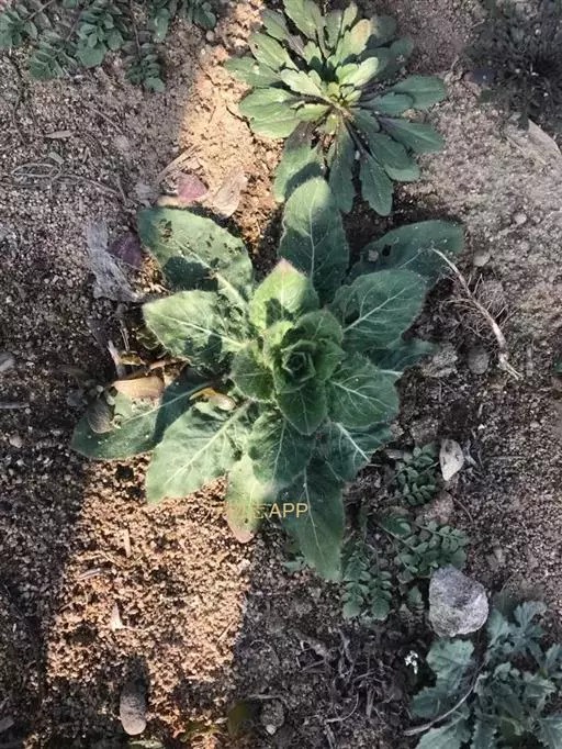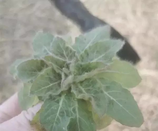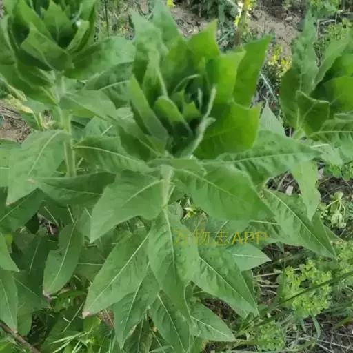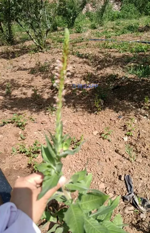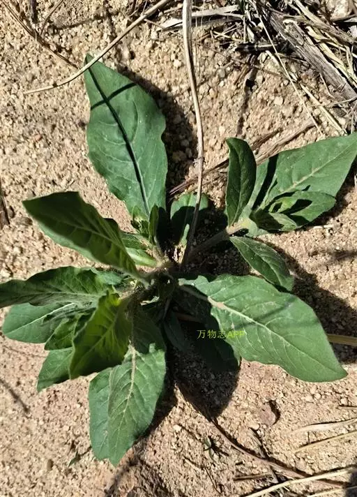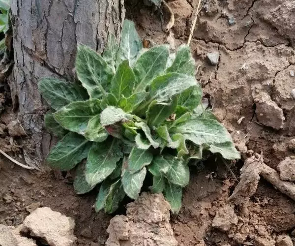一年生草本,主根径达2厘米,全株尤茎上部、花序、叶、苞片、萼片蜜被伸展灰白色长毛与腺毛;茎直立,不分枝,或在顶部花序之下少数分枝,高50-100厘米。基生叶宽倒披针形,长达12厘米,宽达2.5厘米,先端锐尖,基部渐狭下延至柄。
