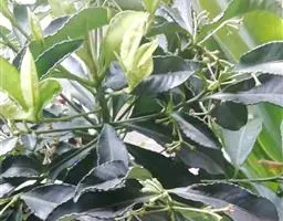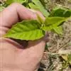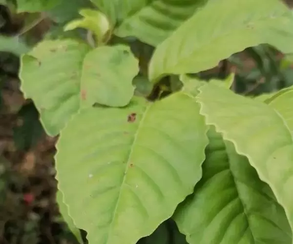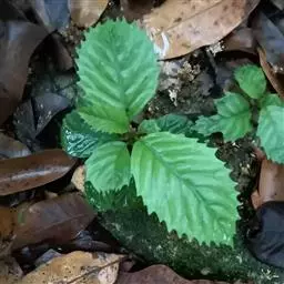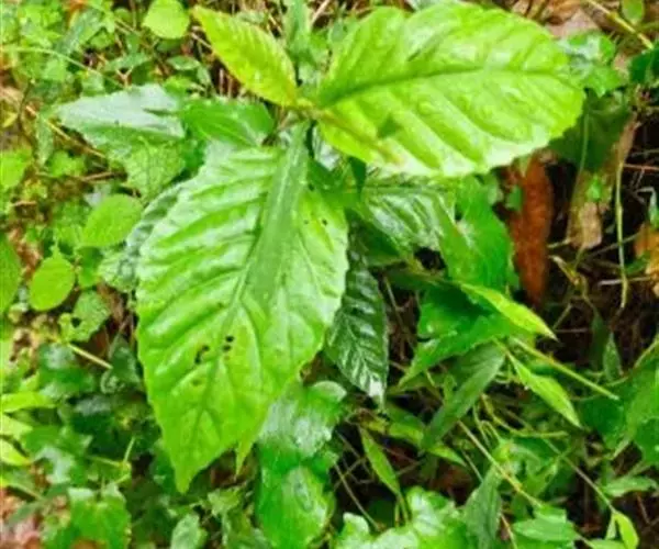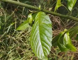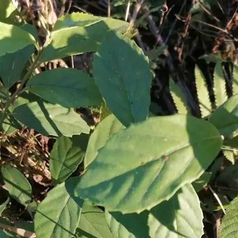 叶片纸质或近坚纸质,广椭圆状卵形至椭圆形,顶端急尖或突然渐尖,基部楔形,长7-11厘米,宽3-5厘米,边缘从中下部以上具粗锯齿,下部常全缘,幼时两面被密长硬毛,以后叶面除脉外近无毛,背面被长硬毛,中脉隆起,侧脉7-9对,尾端直达齿尖,叶柄长7-10毫米,被长硬毛或短柔毛。