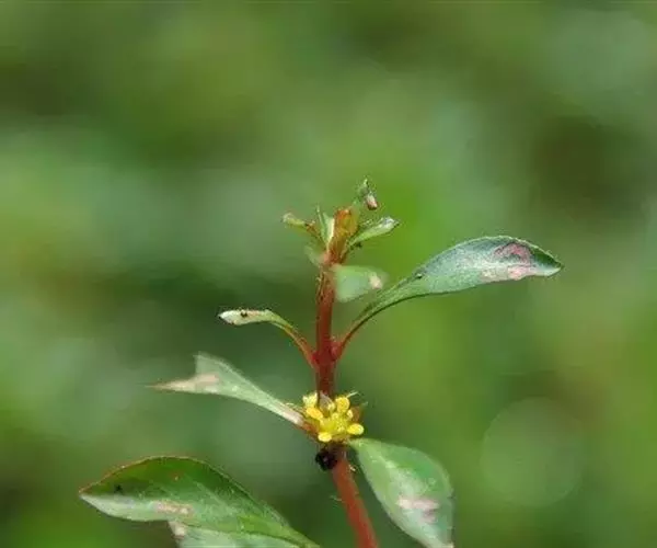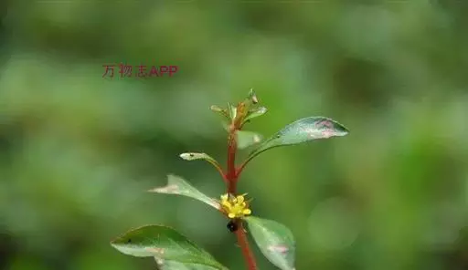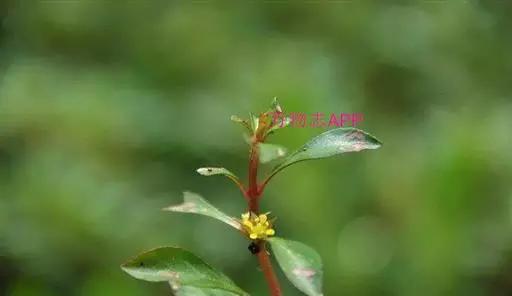 多年生匍匐草本,近无毛,节上生根;茎长达50厘米,茎枝顶端上升。叶卵形至椭圆形,长1-2.2厘米,宽0.5-1.5厘米,先端锐尖,基部骤狭成具翅的柄,侧脉4-7对,无毛;叶柄长2-7毫米。花单生于茎枝上部叶腋,几乎无梗;小苞片2,生花基部;卵状长圆形,长约1.8毫米,宽约0.4毫米;萼片4,卵状三角形,长2-3毫米,宽1-2毫米,先端锐尖,边缘有微毛;花瓣不存在;雄蕊4;花丝长0.5-0.8毫米;花药淡黄色,近基着生,近球形,长0.6-0.9毫米,花粉粒以单体授粉;花盘隆起,绿色,深4裂,无毛,裂片对瓣;花柱绿色,长0.6-1毫米,无毛;柱头绿色,头状,径0.3-0.5毫米。