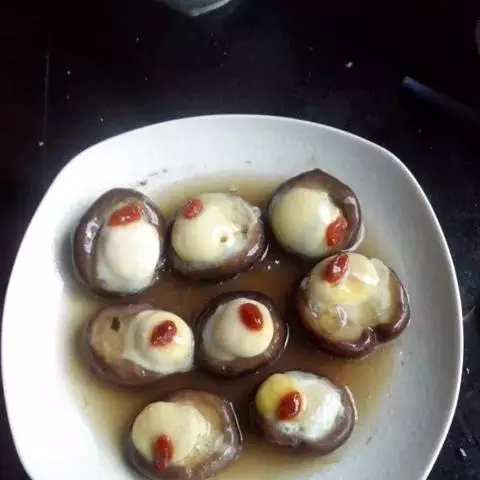 4.把鸡肉、蟹柳、冬菇排在兜中,倒入蛋汁,用慢火蒸4分钟,打开锅盖让蒸气散去,然后再盖上锅盖蒸,每蒸之或3分钟把锅盖打开1次,直到蒸熟,约蒸9分钟。这样蒸熟的蛋,面光滑又嫩。