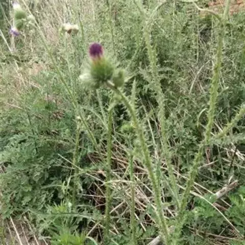 多年生直立草本,高约75厘米。根粗厚,圆柱形,通常不分枝,表皮棕褐色。茎灰白色、淡紫灰色至深紫色,单生,坚硬,光滑,上部3歧式1-4回叉状分枝,基部常残留枯死的叶或成纤维状。基生叶长椭圆状卵形,长5-8.5厘米,宽2.5-5厘米,边缘有粗锯齿,齿端刺尖,基部心形至深心形,表面绿色,背面淡绿色,无毛,叶脉7-9条,掌状,两面隆起;叶柄长6-11.5厘米;茎下部叶有短柄,与基生叶同形或有分裂,茎上部叶无柄,浅裂至3-5深裂,裂片披针形,边缘疏生1-4刺状齿,表面及边缘略带浅蓝色。