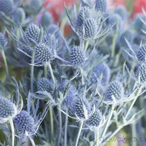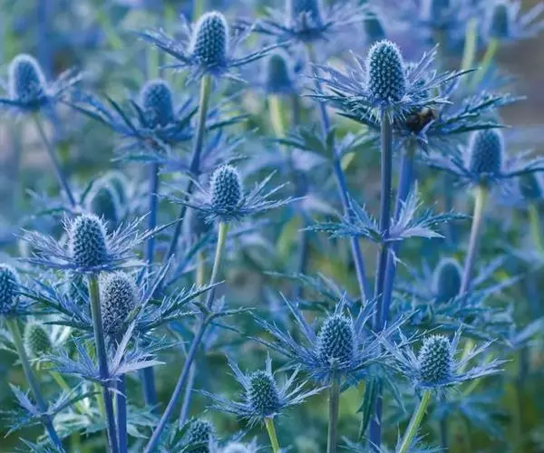 几乎所有的刺芹都是优秀的鲜花和干燥花材料。这些花朵在室内作为干燥花时,依然可以保持它们美丽的蓝色色泽。在整个花序和花苞片变蓝后就可以收获花朵了。当前市场上常见的主要品种有:蓝精灵(Bule Hobbit)、蓝闪光(Glitter Bule)、白闪光(Glitter White)等若干品种。其中,‘蓝精灵’扁叶刺芹,需全光,株高约30cm,世界上第一个紧凑的盆栽刺芹属植物,春季植株在12-18℃的温度条件下开始生长,不耐高温。