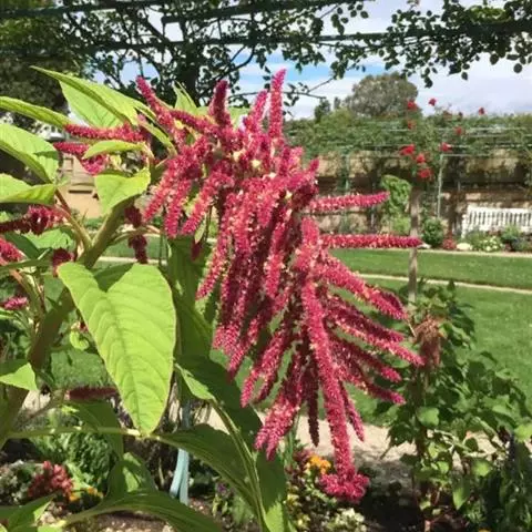 一年生草本,高80-150厘米;茎粗壮,绿色或红色,常分枝,幼时有毛或无毛。 苋 叶片卵形、菱状卵形或披针形,长4-10厘米,宽2-7厘米,绿色或常成红色,紫色或黄色,或部分绿色加杂其他颜色,顶端圆钝或尖凹,具凸尖,基部楔形,全缘或波状缘,无毛;叶柄长2-6厘米,绿色或红色。花簇腋生,直到下部叶,或同时具顶生花簇,成下垂的穗状花序; 花簇球形,直径5-15毫米,雄花和雌花混生;苞片及小苞片卵状披针形,长2.5-3毫米,透明,顶端有1长芒尖,背面具1绿色或红色隆起中脉;花被片矩圆形,长3-4毫米,绿色或黄绿色,顶端有1长芒尖,背面具1绿色或紫色隆起中脉;雄蕊比花被片长或短。胞果卵状矩圆形,长2-2.5毫米,环状横裂,包裹在宿存花被片内。种子近圆形或倒卵形,直径约1毫米,黑色或黑棕色,边缘钝。花期5-8月,果期7-9月。