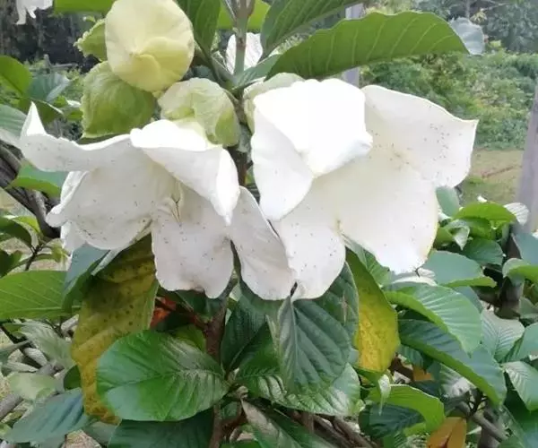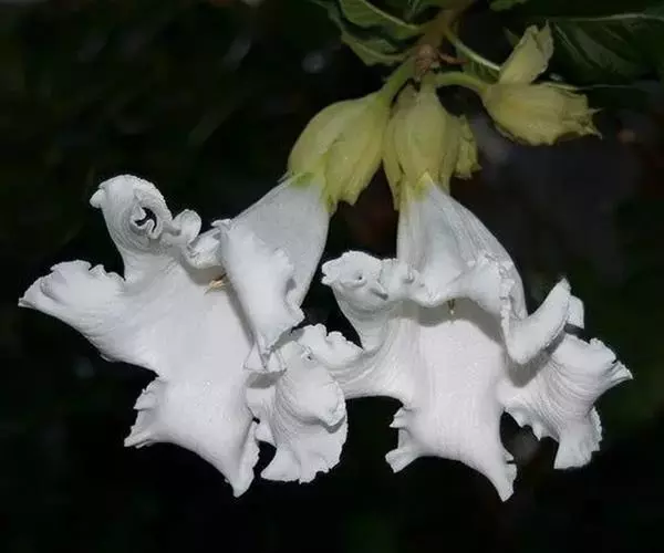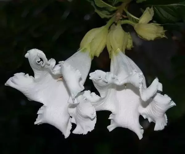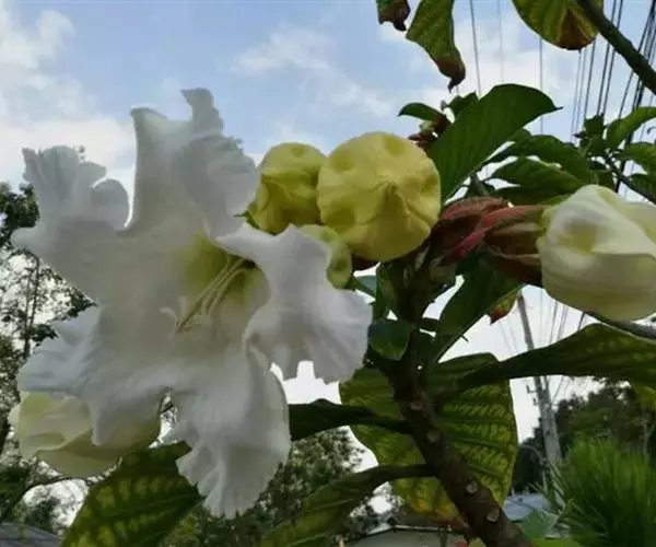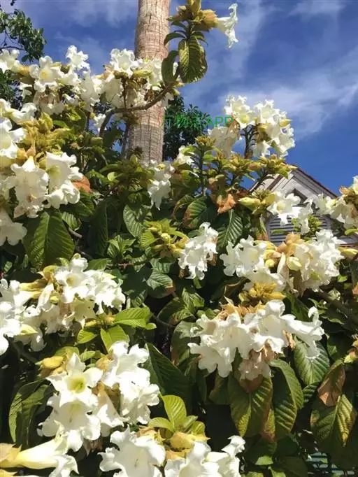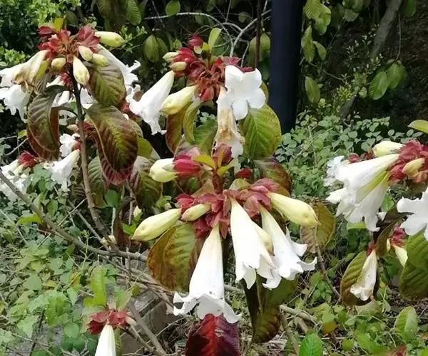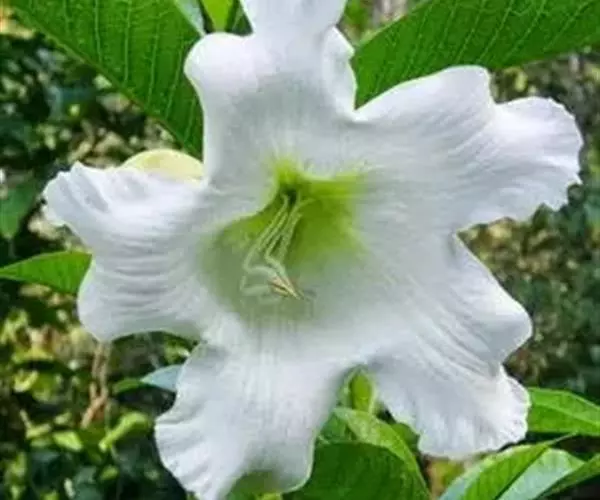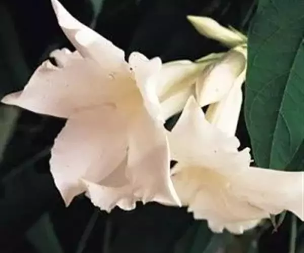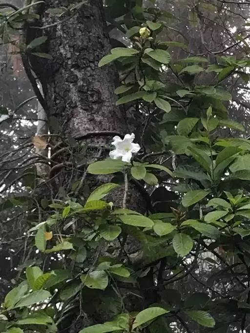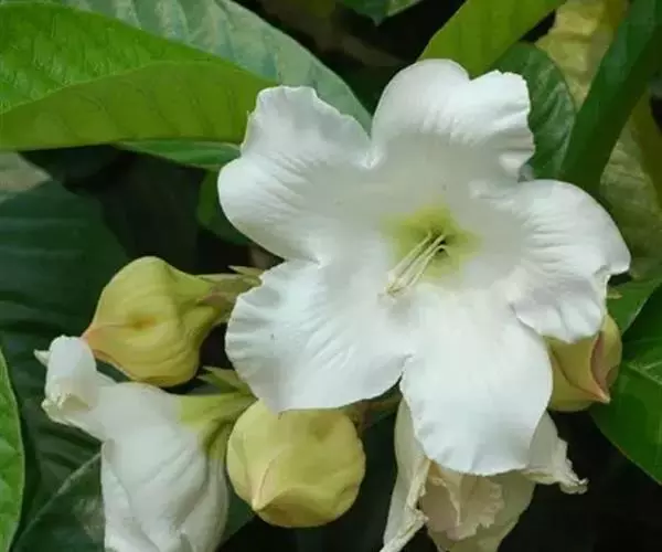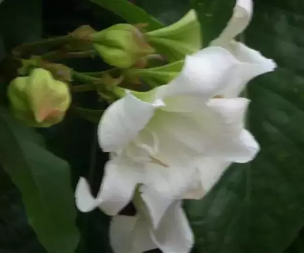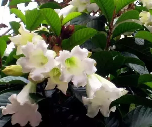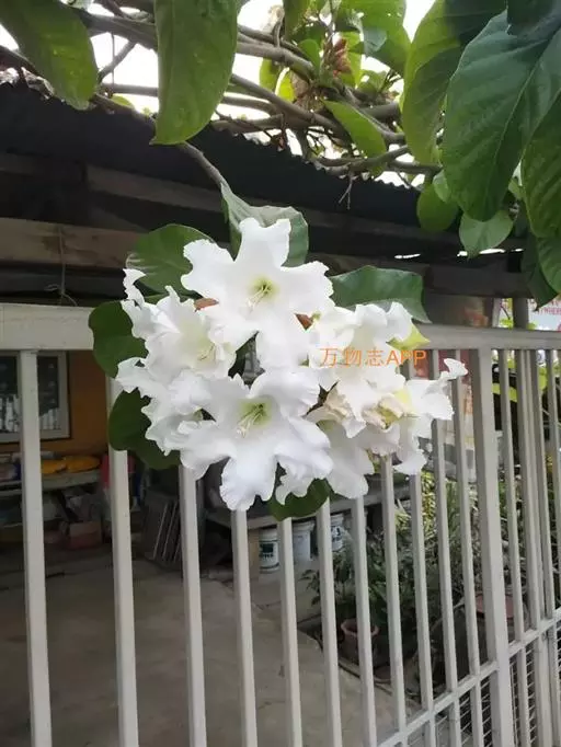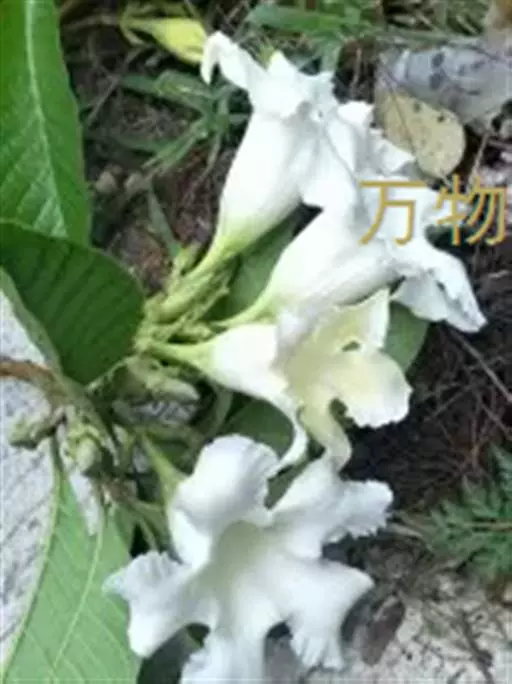清明花为常绿木质大藤本,具乳汁,茎有皮孔;卵形叶对生,先端锐尖,有小毛,侧脉明显;聚伞花序顶生,着花3—5朵,有时更多;花大,漏斗形,白色,有香气,花冠5裂片;蓇葖果形状多变,内果皮亮黄色,种子有白色绢质种毛。果期秋冬季。根、叶供药用,可治风湿性腰腿痛、跌打损伤等。