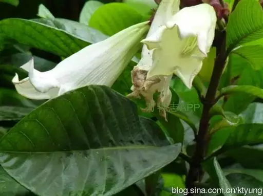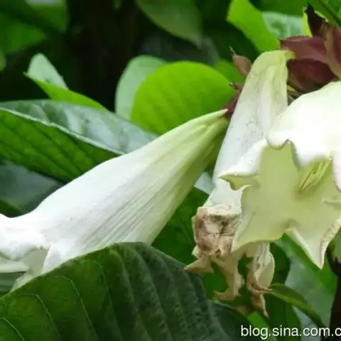 聚伞花序顶生,着花3-5朵,有时更多;花梗有锈色柔毛,长2-4厘米;花萼裂片长圆状披针形或倒卵形,或倒披针形,长2.5-4厘米;花冠长约10厘米,外面有微毛,裂片卵圆形;雄蕊着生于花冠筒的喉部,花药箭头状。