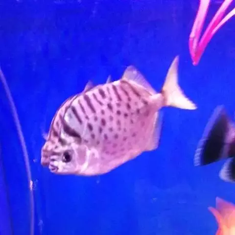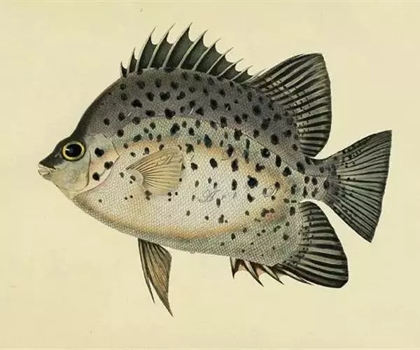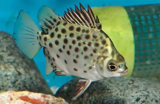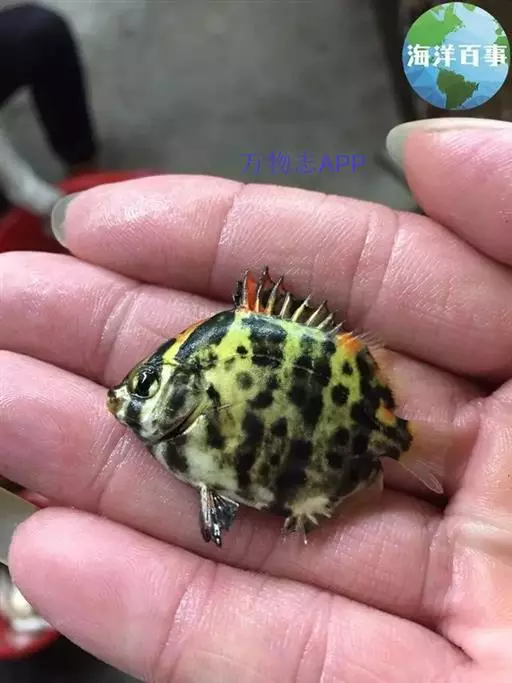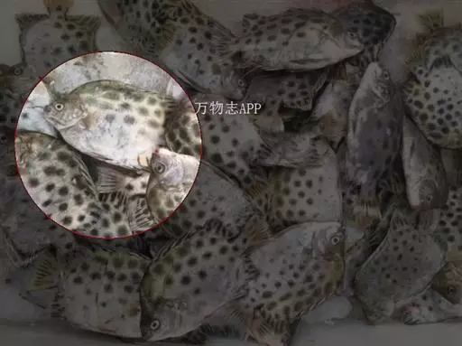 属于金钱鱼科。体略呈椭圆形,侧扁而高,背鳍硬棘与软条间具有深缺刻,体表呈褐色,腹缘银白色,鱼体上有许多深色圆斑。