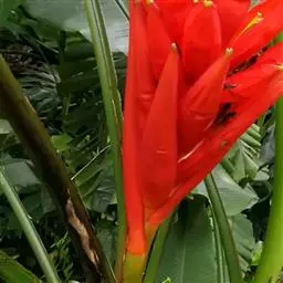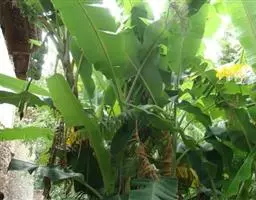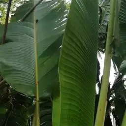 红蕉,假茎高1-2米。叶片长圆形,长1.8-2.2米,宽68-80厘米,叶面黄绿色,叶背淡黄绿色,…