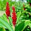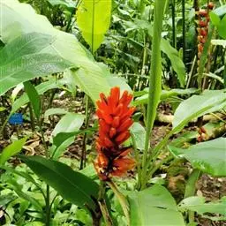 叶片长圆形,长 2~2.2米,宽60~70厘米,先端钝圆,基部近圆形,两侧对称,叶面深绿色,无白粉,叶背浅绿色,被白粉;叶柄短粗,通常长在30 厘米以下,叶翼显著,张开,边缘褐红色或鲜红色。穗状花序下垂,花序轴密被褐色绒毛,苞片外面紫红色,被白粉,内面深红色,但基部略淡,具光泽,雄花苞片不脱落,每苞片内有花2列。花乳白色或略带浅紫色,离生花被片近圆形,全缘,先端有锥状急尖,合生花被片的中间二侧生小裂片长,长约为中央裂片的1/2。