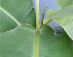 病害症状:初期叶柄上有水渍状腐烂病斑,部分叶片从腐烂部位叶柄折断,叶柄上有无规则水渍状病斑,叶片和叶脉发黄,叶脉变软。中期叶片叶尖开始发黄,并逐步向内侧扩展,随后叶柄发黄、变软、开始腐烂。几天整株香蕉迅速发黄,叶鞘腐烂、发臭,表面腐生一些腐霉菌。