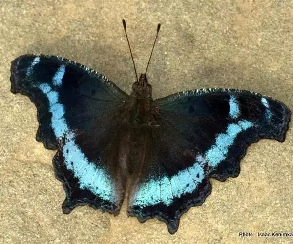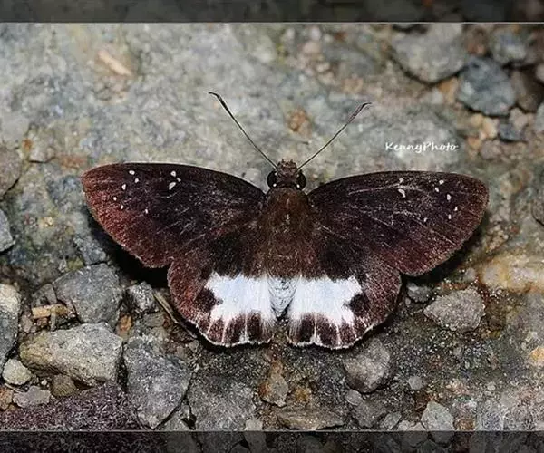 展翅宽55~70mm。翅膀表面深蓝黑色,亚顶端有一个白斑;具1条淡水蓝色带状斑纹,贯穿上、下翅,在前翅呈“Y”状;翅膀腹面斑纹杂乱,以黑褐色为主,下翅中央有1枚小白点。雌雄差异不明显。