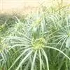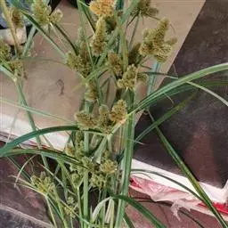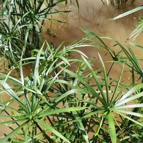 旱伞草 旱伞草是多年湿生、挺水植物,高40~160厘米。茎秆粗壮,直立生长,茎近圆柱形,丛生,上部较为粗糙,下部包于棕色的叶鞘之中。叶状苞片非常显著,约有20枚,近等长,长为花序的两倍以上,宽2~11毫米,叶状苞片呈螺旋状排列在径秆的顶端,向四面辐射开展,扩散呈伞状。聚伞花序,有多数辐射枝,每个辐射枝端常有4~10个第二次分枝;小橞多个,密生于第二次分枝的顶端,小橞椭圆形或长椭圆状披针形,压扁,长3~8毫米,具6朵至多朵小花;花两性,无下位刚毛,鳞片二列排列,卵状披针形,顶端渐尖,长约2毫米,具锈色斑点,花药顶端有刚毛状附属物,花柱3枚。果实为小坚果,椭圆形近三棱形,长约1毫米。果实9~10月份成熟,花果期为夏秋季节。矮旱伞草植株低矮,高20~25厘米,总苞伞状。银旱伞草草径和叶有白色线条,呈现白绿相间。