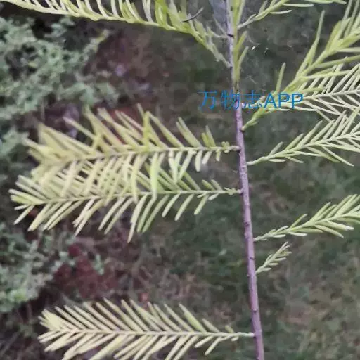 叶条形,扁平,基部扭转在小枝上列成二列,羽状,长1-1.5厘米,宽约1毫米,先端尖,上面中脉凹下,淡绿色,下面黄绿色或灰绿色,中脉隆起,每边有4-8条气孔线,凋落前变成暗红褐色。