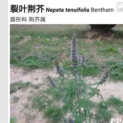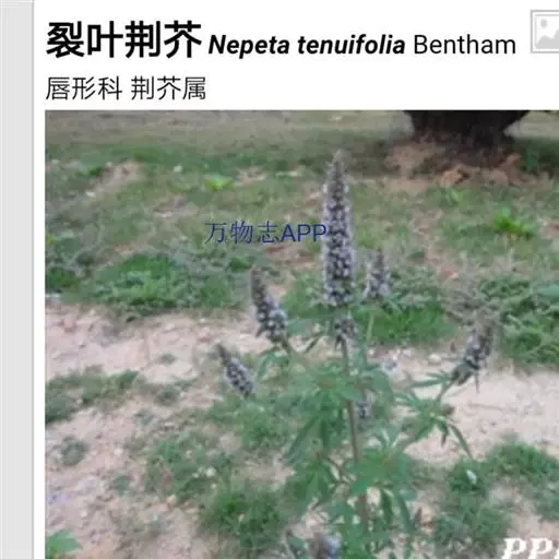 裂叶荆芥(学名:Nepeta tenuifolia Benth.)是唇形科裂叶荆芥属植物。一年生草本,一年生草本。茎高0.3-1米,四棱形,多分枝,被灰白色疏短柔毛,茎下部的节及小枝基部通常微红色。叶通常为指状三裂,大小不等,长1-3.5厘米,宽1.5-2.5厘米。花序为多数轮伞花序组成的顶生穗状花序,长2-13厘米。小坚果长圆状三棱形,长约1.5毫米,径约0.7毫米,褐色,有小点。花期7-9月,果期在9月以后。
