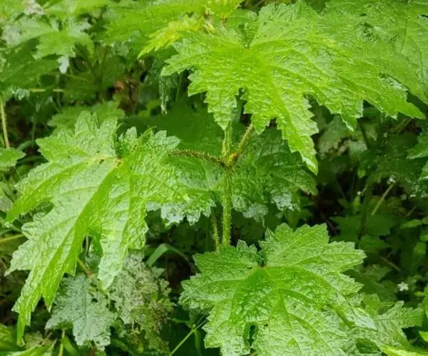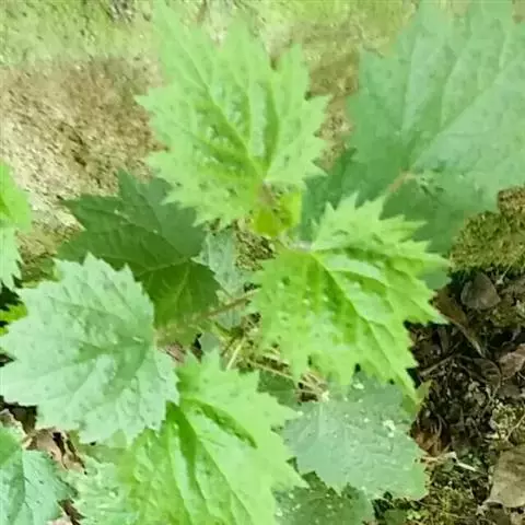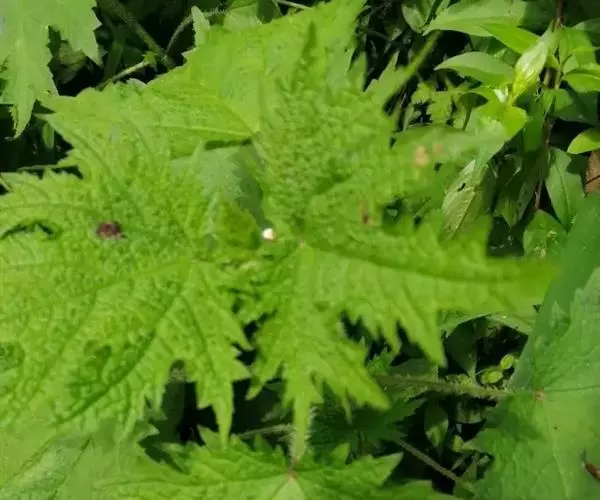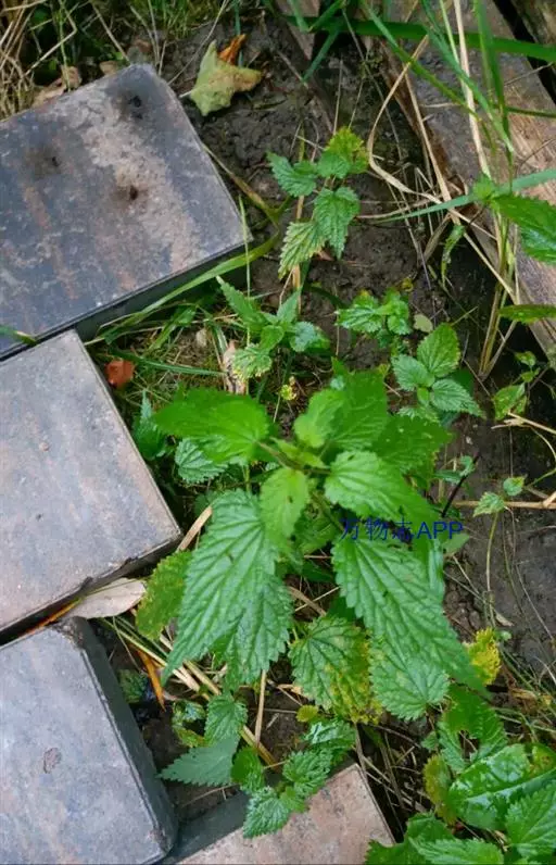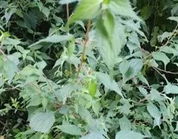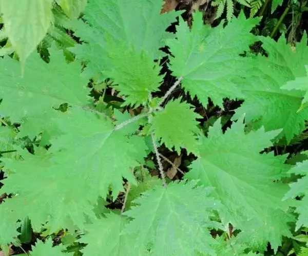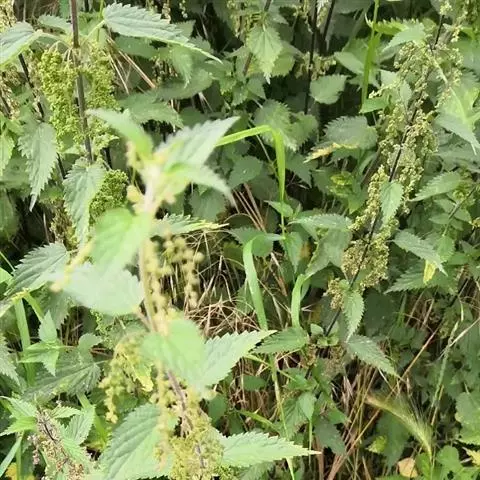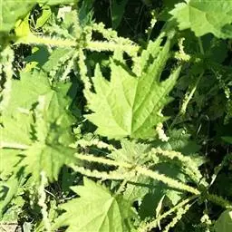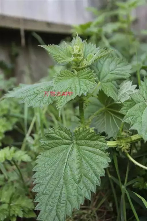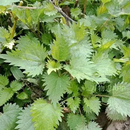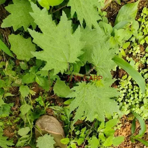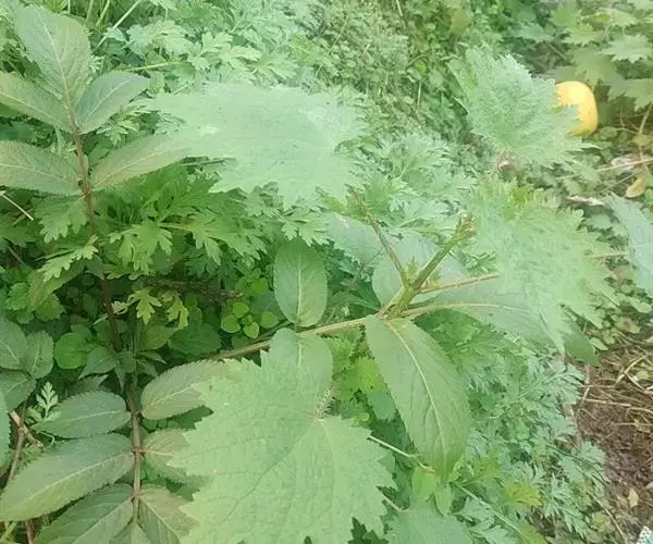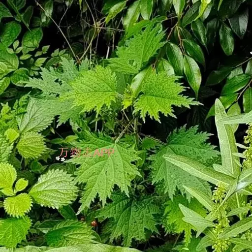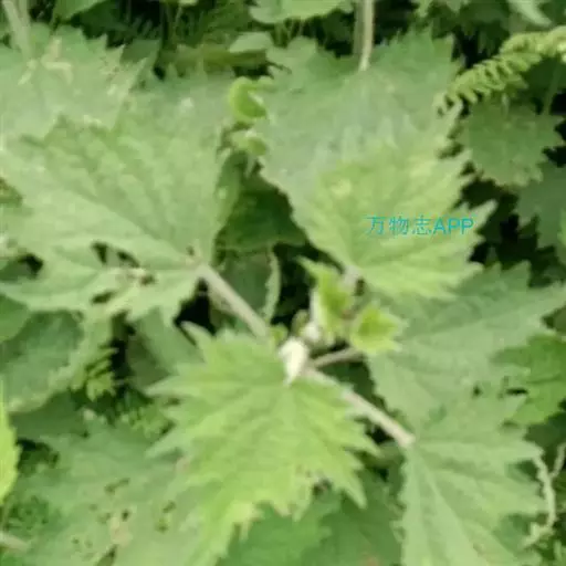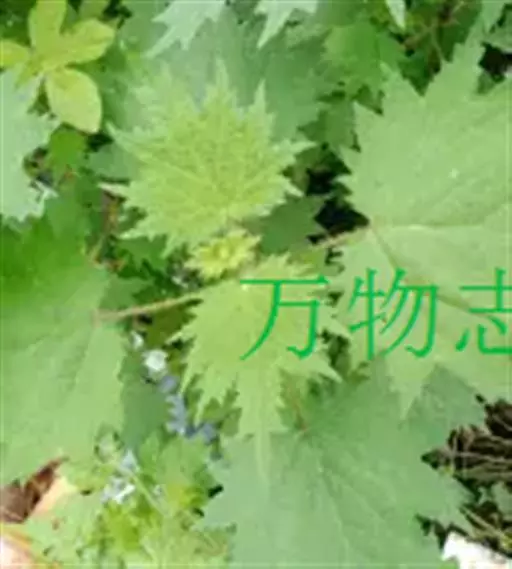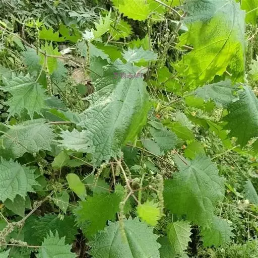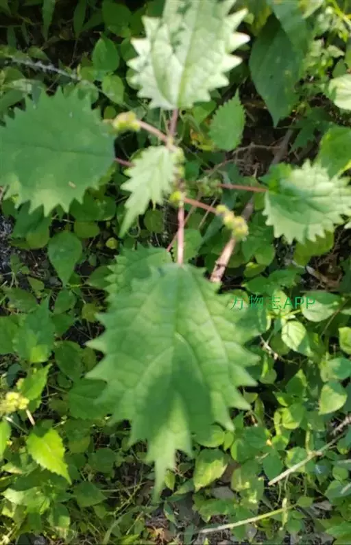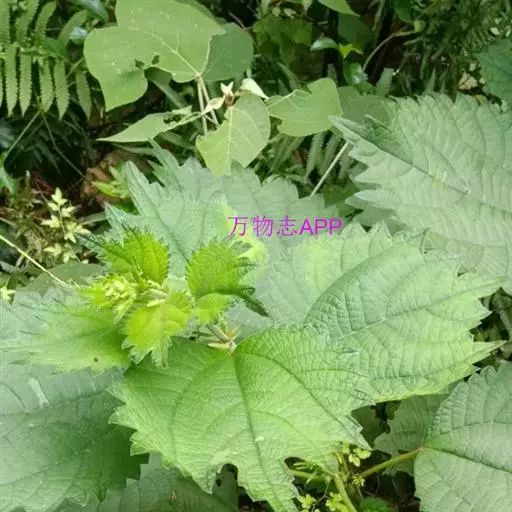 荨麻(学名:Urtica fissa E. Pritz.):多年生草本植物,高可达100厘米,四棱形,分枝少。叶片近膜质,宽卵形、椭圆形、五角形或近圆形轮廓,裂片自下向上逐渐增大,三角形或长圆形,上面绿色或深绿色,下面浅绿色,叶柄密生刺毛和微柔毛;托叶草质,绿色,雌雄同株,花序圆锥状,雄花具短梗,花被片在中下部合生,雌花小,几乎无梗;瘦果近圆形,表面有带褐红色的细疣点;8-10月开花,9-11月结果。