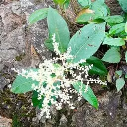 圆锥花序宽大,多分枝,排成伞房状,长10-20厘米,多花密集,密被锈色微柔毛;苞片卵状披针形,长5-10毫米,背面被锈色微柔毛;花黄色,杂性,无花梗或具短梗;花萼外面密被锈色微柔毛,裂片卵状披针形,先端急尖,长约4毫米,宽约1.5毫米;花瓣线状披针形,长7-9毫米,宽约1.2毫米,外面被锈色微柔毛,里面疏被毛或近无毛,开花时外卷;雄蕊7-10,通常仅1个发育,长8-9毫米,在两性花中长5-6毫米,不育雄蕊较短(长3-4毫米),花丝基部多少合生,花药小,卵圆形;子房倒卵圆形,长约2毫米,无毛,花柱钻形,长4-5毫米。