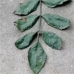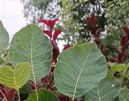 粉背黄栌叶卵圆形,较大,长3.5-10厘米,宽2.5-7.5厘米,无毛,但叶背显著被白粉;叶柄较长,…