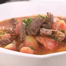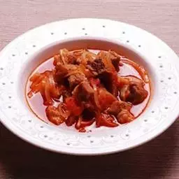 (3)烧热油3大匙,爆香蒜茸,下咖喱酱及糖1小匙炒香,倒入牛肉,爆透后加水盖过牛肉,煮滚后转慢火,炖至筷子可以插入牛肉时即可放余下的调味料,继续炖至牛肉够烂时,加入土豆再炖片刻,最后加入洋葱即成。