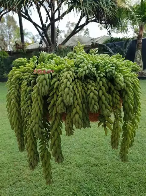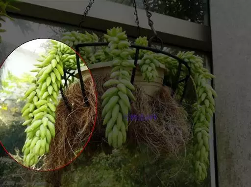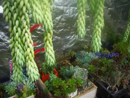 玉缀群生 玉缀 Sedum morganianum 名字起源于日本,日本考古学家在挖掘古坟时,发现一些由玉或玛瑙等宝石制成的玉饰,这些玉饰的造型弯曲如勾,所以便称为“勾玉”,这在日本漫画、小说中相当常见。后来多肉植物界引进玉缀时,观察她叶片的形状很像勾玉,而整串的叶片犹如成串的勾玉,所以这植物便命名为玉つづり,つづり日文就是“缀”,缀玉成串的多肉植物便是“玉缀”,很好听且达意的名字。当然引申意思也可以称为“玉串”或“玉帘”,因此玉缀的别名也有玉帘、玉串、玉珠帘。