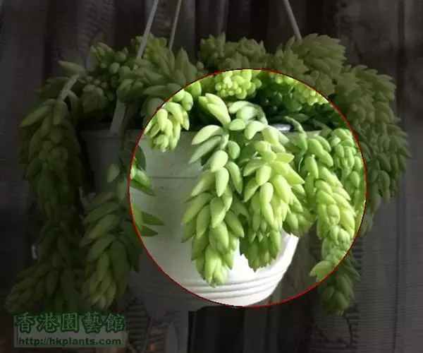 玉缀茎匍匐生长,故常悬挂栽培任其下垂。叶片披针形弯曲如香蕉,叶端尖,长度约2cm,叶色青绿带有透明感,叶表裹着一层粉,看起来非常粉嫩。花梗从枝端的叶腋凑出,通常会从不同叶腋抽生出几个花梗,一个花梗一朵花,花朵钟形桃红色,玲珑精致。