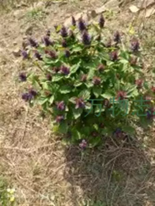 穗状花序顶生,偏向一侧,长3.5-4.5厘米,由多数轮伞花序所组成;苞片近圆形或宽卵圆形,长约5毫米,宽6-7毫米,先端具尾状骤尖,尖头长1-1.5毫米,除边缘被小缘毛外余部无毛,极疏生腺点,染紫色;花梗长不及1毫米,近无毛,序轴被短柔毛。花萼钟形,长2-2.5毫米,外面被白色短硬毛,具腺点,萼齿5,三角形,近相等,先端刺芒尖头,边缘具缘毛。花冠玫瑰红紫色,长6-7毫米,微内弯,近漏斗形,外面密被柔毛,内面有毛环,冠筒基部宽约0.5毫米,向上渐宽,至喉部宽不及2毫米,冠檐二唇形,上唇直立,先端微缺,下唇开展,3裂,中裂片圆形,全缘,侧裂片截形或近圆形。雄蕊4,前对较长,均伸出,花丝无毛。花柱超出雄蕊,先端近相等2浅裂,裂片钻形。小坚果长圆形,长1.5毫米,黑棕色,具小疣。花、果期9-11月。