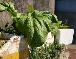 二年生草本,被粉霜。茎粗壮,直立,高0.5-1米,茎的全部叶腋有大的柔软叶芽,直径2-3厘米。二年生茎有分枝,具茎生叶。基生叶及下部茎生叶长圆状倒卵形至圆形,长和宽达30厘米。顶端圆形,基部骤窄成极短有宽翅的叶柄,边缘有波状不显明锯齿;上部茎生叶卵形或长圆状卵形,长8-13.5厘米,宽3.5-7厘米,基部抱茎;最上部叶长圆形,长约4.5厘米,宽约1厘米,抱茎。
