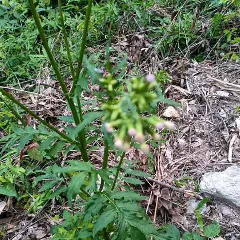 茎直立,绿色,带淡红色,多分枝,分枝粗壮,全部茎枝被稀疏蛛丝毛及乳突状短毛并混杂以黄色小腺点。