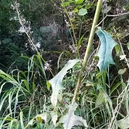 基生叶卵形,长25 一50厘米或更长,宽10-30厘米或更宽,顶端急尖或钝,有小尖头,基部心形或宽心形,有长叶柄,边缘有稀疏的刺尖,两面异色,上面绿色,被稀疏的乳突状毛及黄色小腺点,下面灰白色,被稠密的绒毛及黄色小腺点;中部与上部茎叶与基生叶同形,并具有等样及等量的毛被;最上部茎叶卵形或卵状长椭圆形。