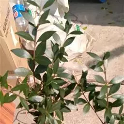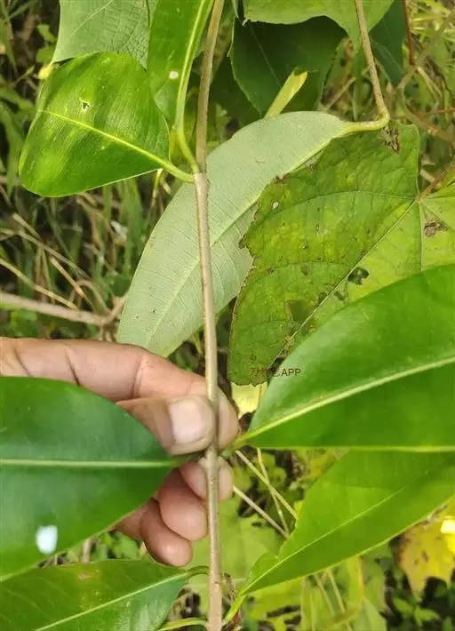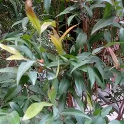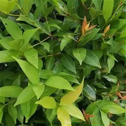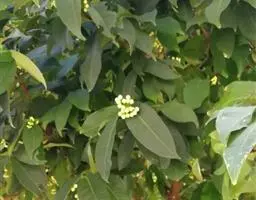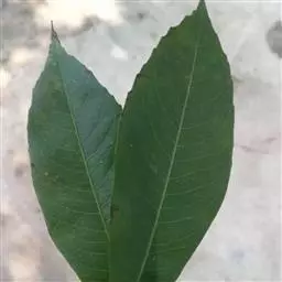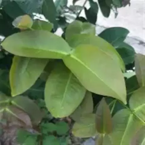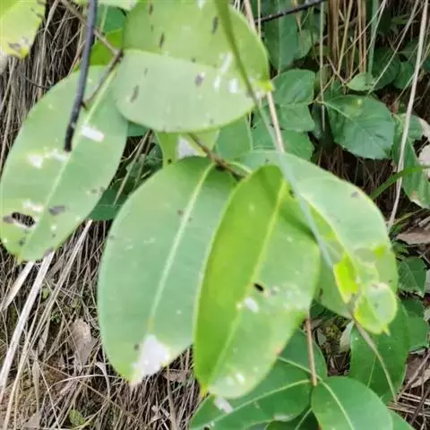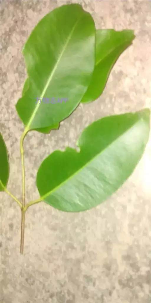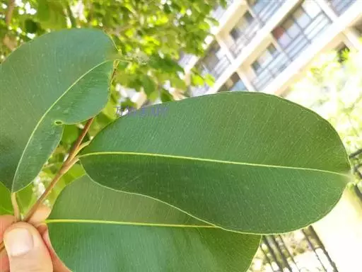 叶对生,革质,椭圆形至长椭圆形,长6-14cm。宽3-7cm,先端钝或短尖头,基部浑圆或阔楔形,深绿色且有光泽,具透明小腺点,揉之有香气,侧脉近平行斜出于叶缘连成边脉;叶柄长约2cm。