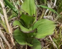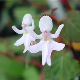 花序对生于叶,出自茎上部,斜出,比叶短,不分枝;花序轴纤细,总状花序疏生许多花;花苞片很小,卵状三角形,长约1毫米,先端急尖;花梗和子房长约5毫米;花开展,萼片和花瓣黄绿色带紫红色条纹;中萼片近椭圆形,舟状,长5-5.5毫米,宽2-2.5毫米,先端锐尖,具3条脉;侧萼片稍斜倒卵形,等长于中萼片而较宽,先端钝,具3条脉。