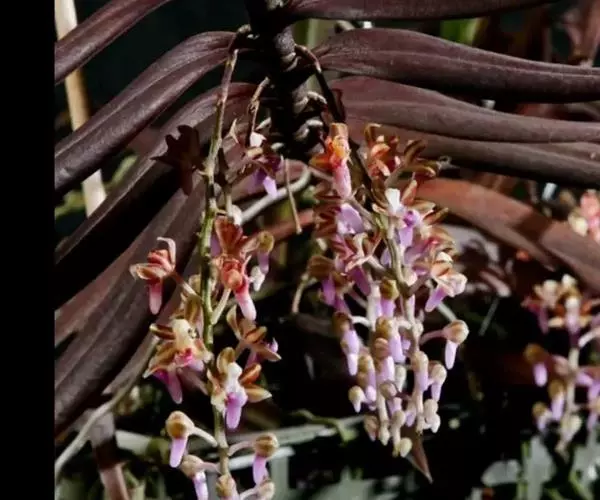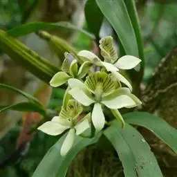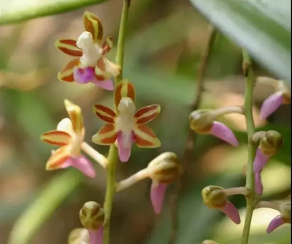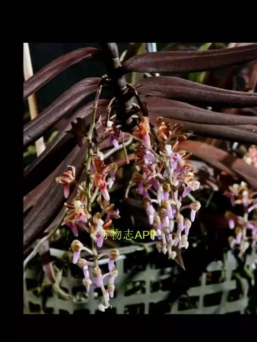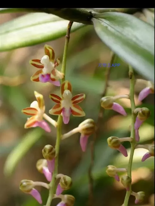 尖喙隔距兰(学名:Cleisostoma rostratum (Lodd. ) Seidenf. ex Averyanov):茎伸长,近圆柱形,长20-45厘米,粗约5毫米,有时上部分枝,具多节,节间长2-3厘米。叶二列,革质,扁平,狭披针形;叶鞘革质,紧抱于茎。花序对生于叶,出自茎上部,斜出,比叶短,不分枝;花序轴纤细,总状花序疏生许多花;花开展,萼片和花瓣黄绿色带紫红色条纹;中萼片近椭圆形,舟状;唇瓣紫红色,3裂。花期7-8月。