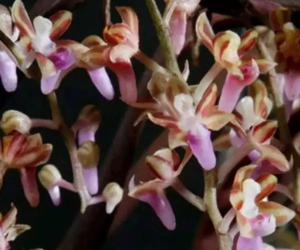 红花隔距兰 Garay):植株通常悬垂。茎细圆柱形,长达70厘米,粗3-4毫米,分枝或不分枝,…