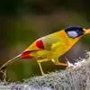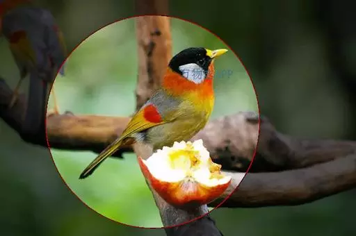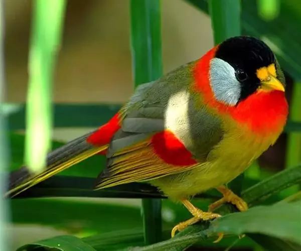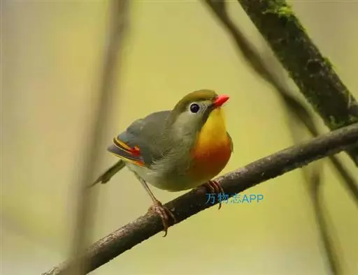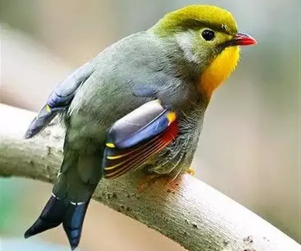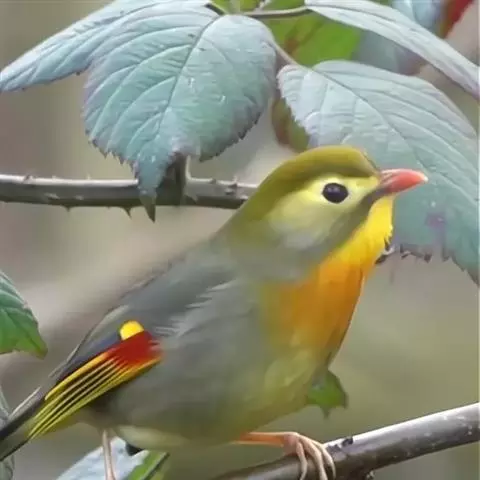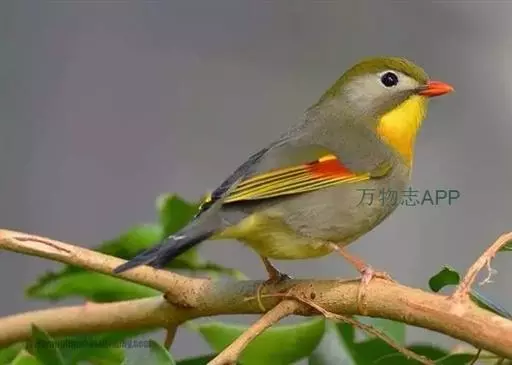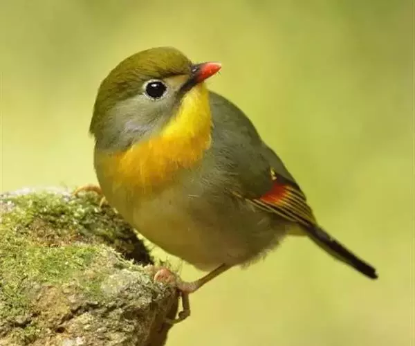 鉴别特征:体形大小似银耳相思鸟,上体从头以至尾上覆羽均为暗灰绿色,头顶绿色较浓;两翅具朱红色翼斑;颏至喉黄色;胸部橙黄;腹部淡白;尾下覆羽浅黄色 。