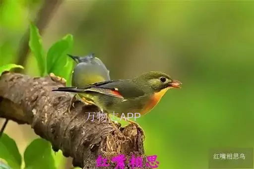 相思鸟(Silver-eared Mesia 学名:Leiothrix)别名红嘴玉、红嘴绿观音、恋鸟,在西方叫“乃丁格”(情鸟)。隶属鹟科、画眉亚科、相思鸟属,栖息于平原及海拔1000米的小丘,活动于常绿阔叶林、灌丛和竹丛间。