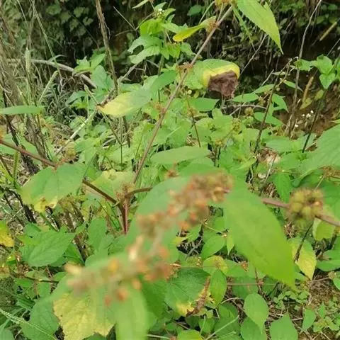 草本或亚灌木;嫩枝被黄褐色茸毛。叶纸质,卵形或卵状披针形,长5-11cm,宽3-7cm,先端尾状渐尖,基部圆形或微心形,两面有稀疏单长毛,基出脉3-5条,侧脉向上行超过叶片中部,边缘有锯齿;叶柄长1-5cm,有疏长毛。聚伞花序腋生,花序柄极短;花柄长3-6mm;苞片长2-3mm,均被长毛;萼片长5mm,先端有角;花瓣比萼片稍短,倒披针形;雄蕊10枚;子房被刺毛,3-4室,花柱短,柱头2-3浅裂。蒴果扁球形;刺长5-7mm,无毛,先端弯勾,基部有毛。