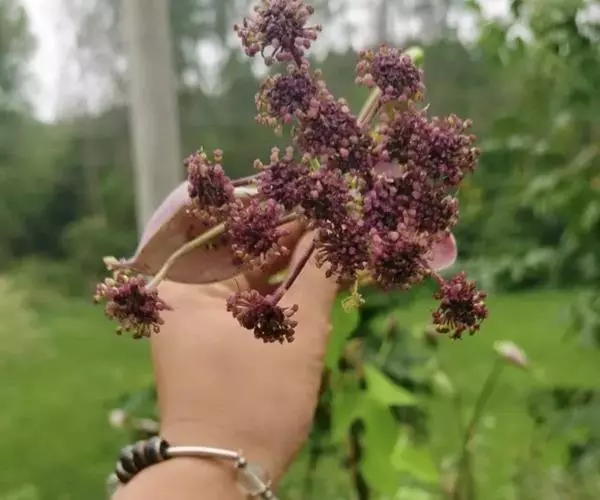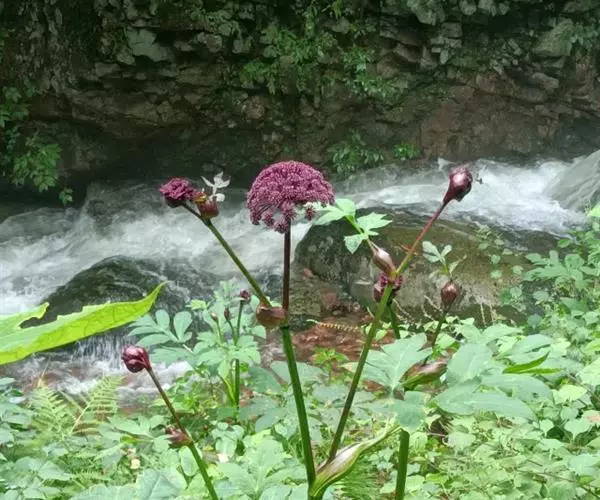 复伞形花序顶生和侧生,花序梗长3-8厘米,有柔毛;伞辐10-22,长2-4厘米;总苞片1-3,卵圆形,阔鞘状,宿存,反折,紫色;小总苞片3-8,线形至披针形,绿色或紫色,无毛;伞辐及花柄有毛;花深紫色,萼齿明显,线状锥形或三角状锥形,花瓣倒卵形或椭圆状披针形,顶端通常不内折成凹头状,花药暗紫色。果实长圆形至卵状圆形,长4-7毫米,宽3-5毫米,无毛,背棱线形隆起,尖锐,侧棱有较厚的狭翅,与果体近等宽,棱槽内有油管1-3,合生面油管4-6,胚乳腹面稍凹入。花期8-9月,果期9-11月。