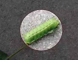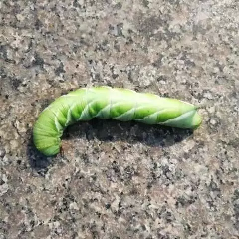 幼虫体长约 9 至 12 厘米。体型肥大,体色有黄、绿、褐、灰等多种,体侧有斜向的斑纹(但会因个体差异而有所不同)。