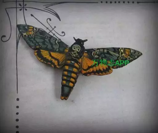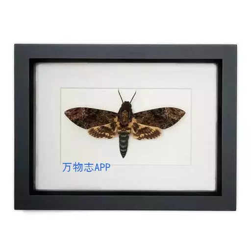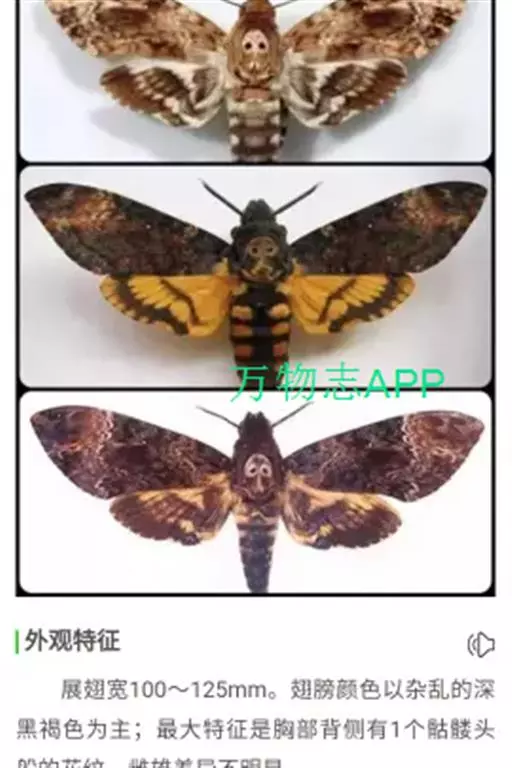展翅宽100~125mm。翅膀颜色以杂乱的深黑褐色为主;最大特征是胸部背侧有1个骷髅头般的花纹。雌雄差异不明显。