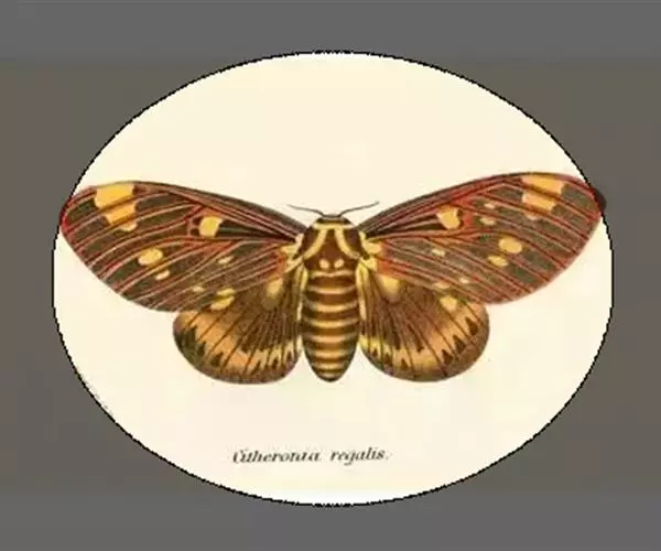 翅展100~125毫米。胸部背面有鬼脸形斑纹,眼点班以上有灰白色大斑,腹部黄色,各环节间有黑色横带,背线蓝色较宽,前翅黑色、青色、黄色相间,内横线、外横线各由数条深浅不同的波状线条组成,中室上有一个灰白色点;后翅黄色,基部、中部及外缘处有较宽的黑色带三条,后角附近有灰蓝色进一块。每年发生一代,成虫七、八月份出现,能吱吱发声,以蛹过冬。幼虫危害胡麻等作物。