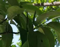 乔木,高达30米,胸径达80厘米;树皮淡灰或深灰色;芽、幼枝、叶柄、叶背、花梗、密被红褐色短绒毛。叶厚革质,长圆状椭圆形,椭圆状卵形或阔披针形,长17-23厘米,宽6-11厘米,先端渐尖或短渐尖,基部阔楔形,圆钝或近心形,通常两侧不对称,上面深绿色,有光泽,下面被红铜色短绒毛,侧脉每边16-26条,末端纤细,直至近叶缘开叉网结,网脉致密;叶柄长1.5-3厘米,无托叶痕。