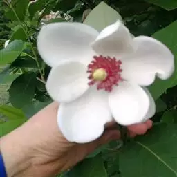 花梗直径约5毫米,具3-4苞片脱落痕;花被片9-12片,淡黄绿色,基部带紫色,外轮3片阔倒卵形,长6-7厘米,中、内轮倒卵形,较狭小;雄蕊约50枚,长2.5-3厘米,花药长1.5-2厘米,花丝深紫色,长0.7-1厘米;雌蕊群长2-3厘米,雌蕊群柄长1.7-2厘米,被银灰色短绒毛;雌蕊长约5毫米,心皮长约3毫米,狭卵圆形,仅基部与花托合生;胚珠约8枚。聚合果长7-20厘米;蓇葖长圆状椭圆体形,长1-2.5厘米。花期3-5月,果期9-10月。