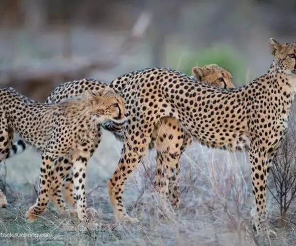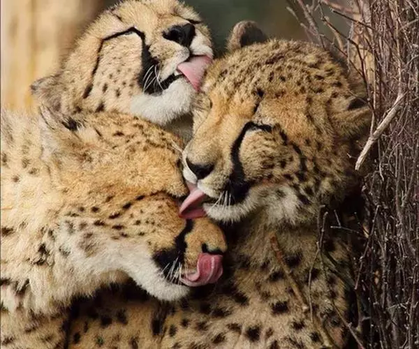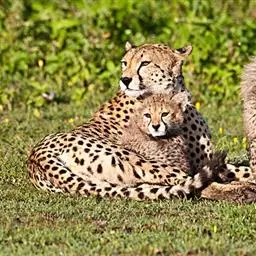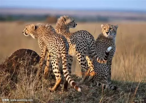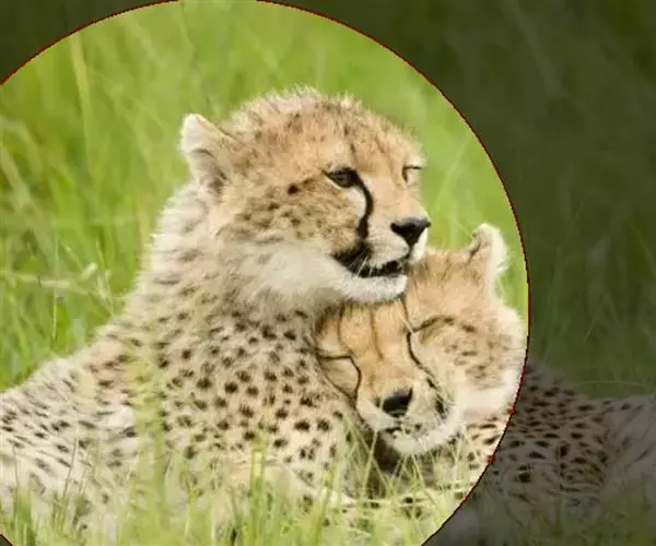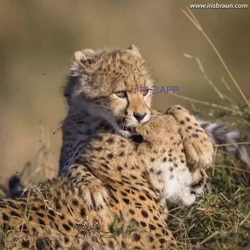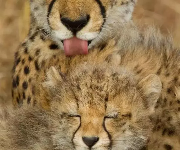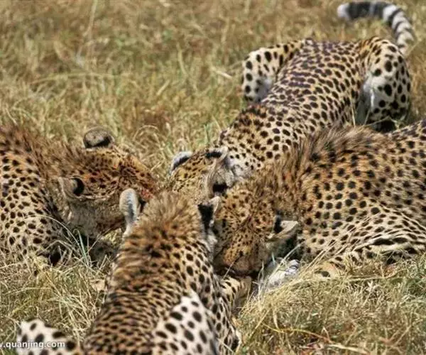 两头猎豹正相互梳理毛发 雄性猎豹一般也会争夺配偶。它不是一夫一妻制,它在野外是自由竞争。怀孕期是91到95天,一只雌性猎豹它一胎可以生1-6幼崽,通常来说是2-4只。产崽的雌性猎豹,将它的巢建在那些草比较密的,或者是丛林的深处,或者是沼泽地,一些其他动物到不了的地方,因为有可能一些猛兽可能会捕食这些小猎豹。